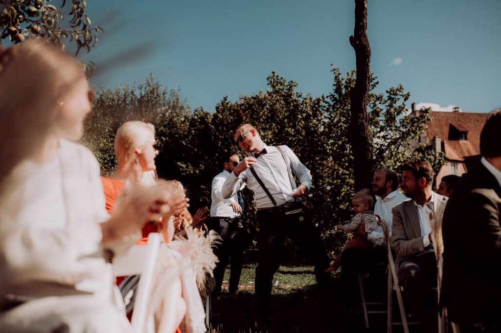 Die Sommerhochzeit im Hotel Freihof in Prichsenstadt war einfach traumhaft! Schon das tolle Wetter sorgte für die perfekte Stimmung, und das Brautpaar, das wir schon von einer Winterhochzeit kannten, strahlte bei ihrer freien Trauung. Die Gäste waren super stilvoll gekleidet, und das Highlight war der beste Freund des Brautpaares, der als Trauredner die Zeremonie hielt – eine persönliche und emotionale Feier.